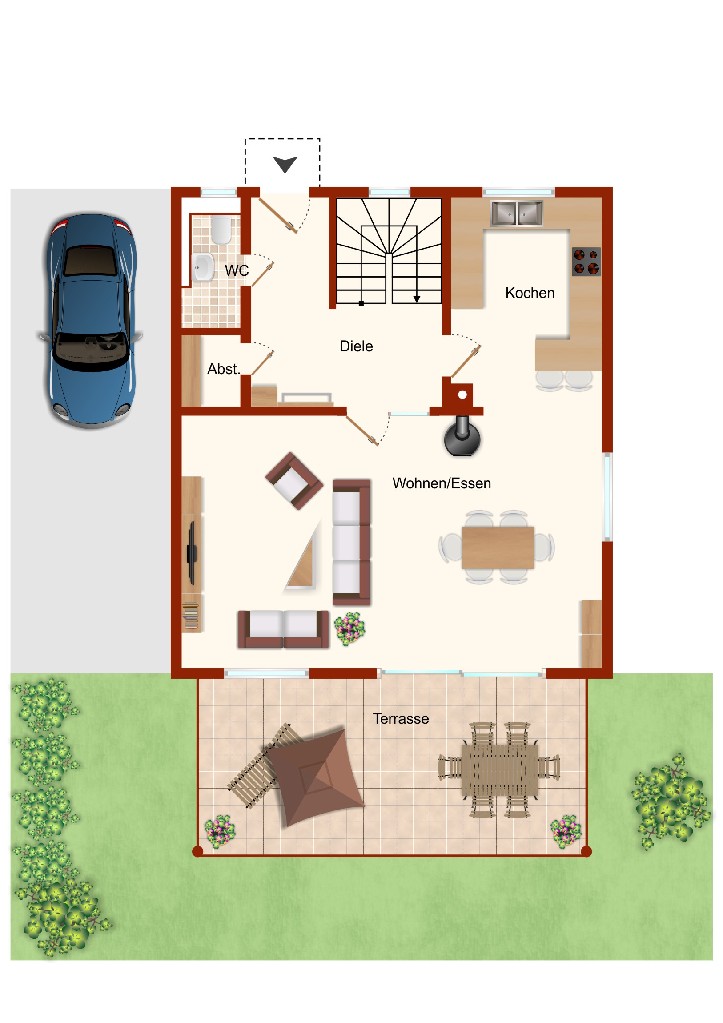 Im Erdgeschoss empfängt Sie ein lichtdurchfluteter Wohn- und Essbereich mit offener Küche, der direkten Zugang zur großzügigen Terrasse bietet. Der großzügige Eingangsbereich mit Garderobe und zusätzlichem Abstellraum, bietet ausreichend Platz wenn ide ganze Familie gleichzeitig nach Hause kommt.