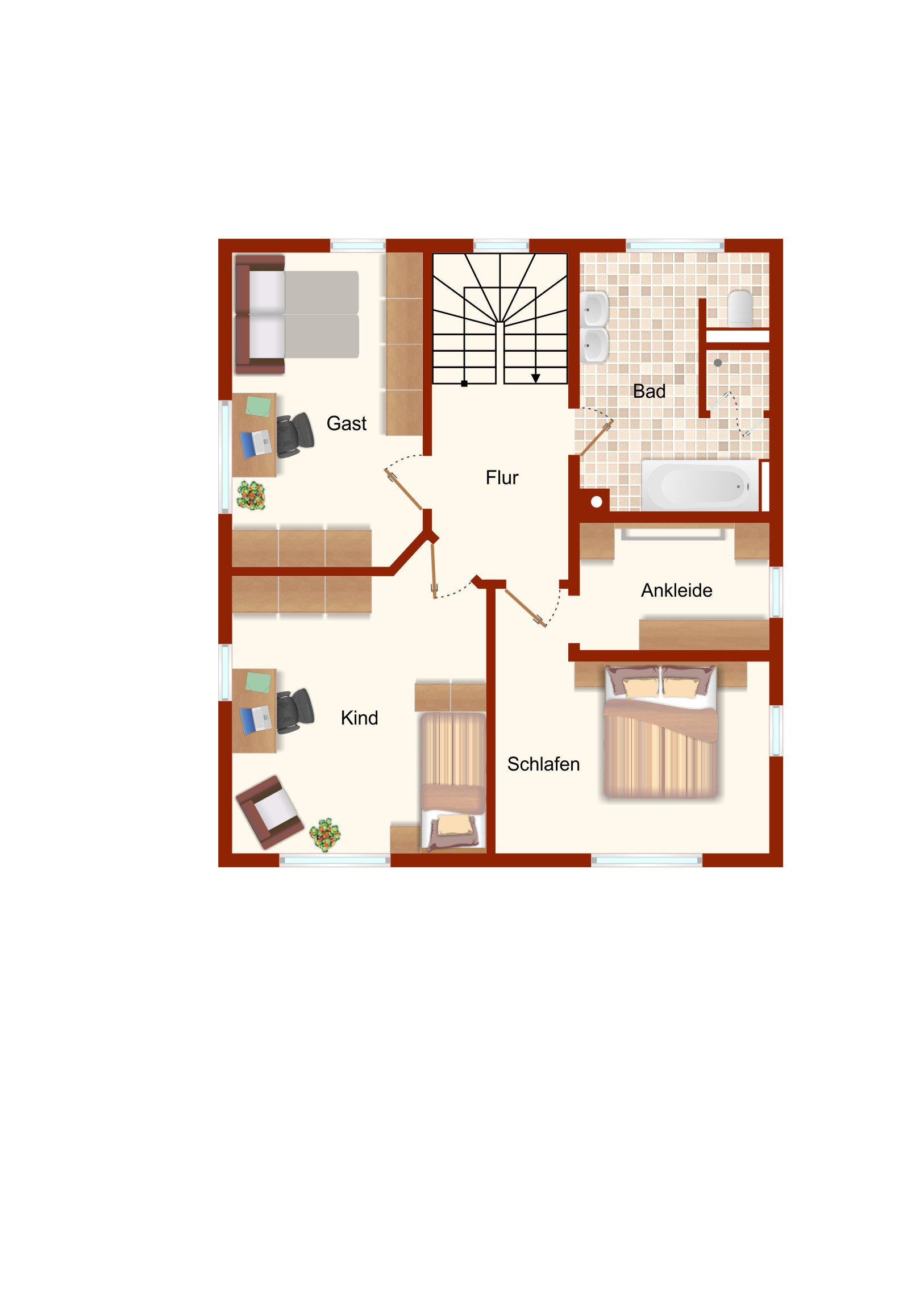 Im Obergeschoss befinden sich die Schlafzimmer sowie ein weiteres Badezimmer. Die Zimmer sind ideal geschnitten und vielseitig nutzbar – als Schlafzimmer, Kinderzimmer, Büro oder Gästezimmer.