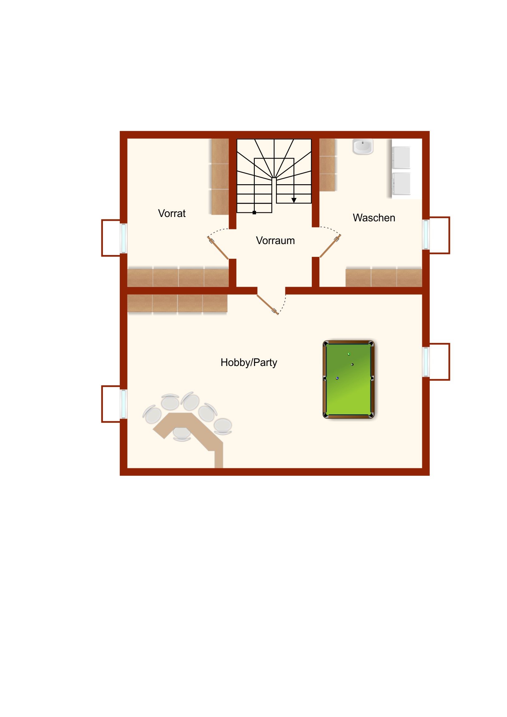 Der voll ausgebaute Keller bietet zusätzlichen Wohnkomfort. Der große Hobbyraum eignet sich perfekt als Fitnessbereich, Atelier, Heimkino oder Spielzimmer. Weitere Abstellflächen ergänzen das Raumangebot.