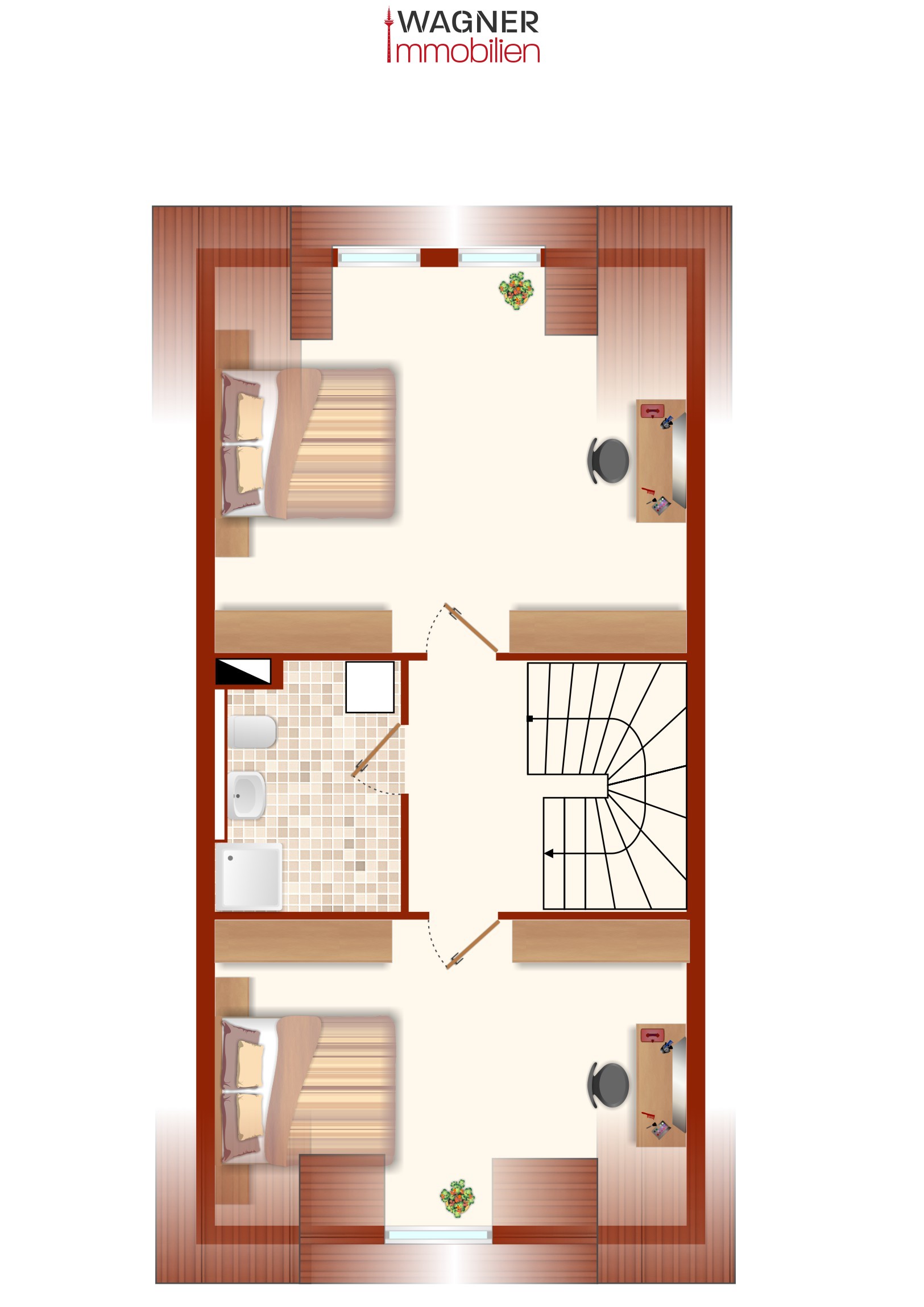 Im 2. Obergeschoss entdecken Sie zwei weitere Zimmer ein weiteres Duschbad. Alle Zimmer sind hell und lichtdurchflutet.